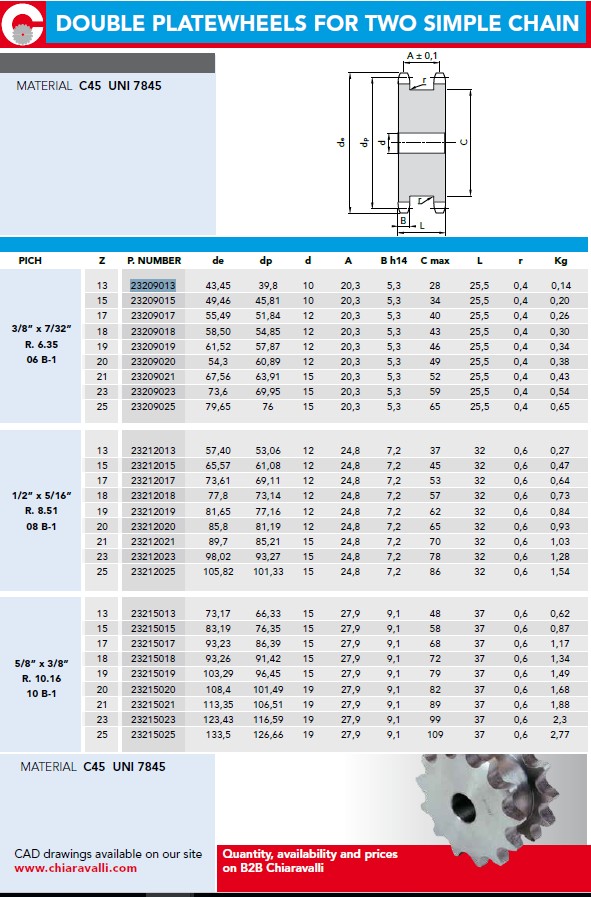 Řetězová kola jsou vyrobena z oceli C45 a nejsou kalená a jsou určena pro válečkový řetěz. Řetězová kola dodáváme jednoduchá (simplex), dvojitá (duplex) a trojitá (triplex). Ve velikosti 04B a 05B se kola vyrábí v počtu zubů 8 – 76, ostatní velikosti 06B – 28B v počtu zubů 8 – 40.